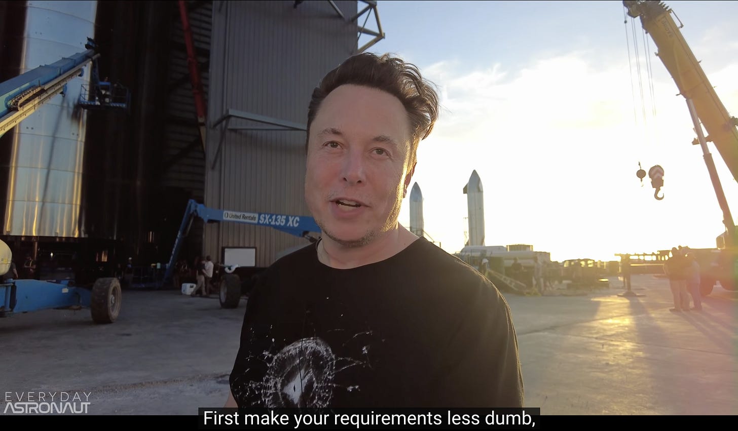 The space theme somehow continues. Questioned on why the grid fins on the new Starship don’t fold, Elon Musk dropped an incredible gem on how to think about development processes (or anything, really). Didn’t expect to find this in a YouTube video touring Starbase, but here we go.